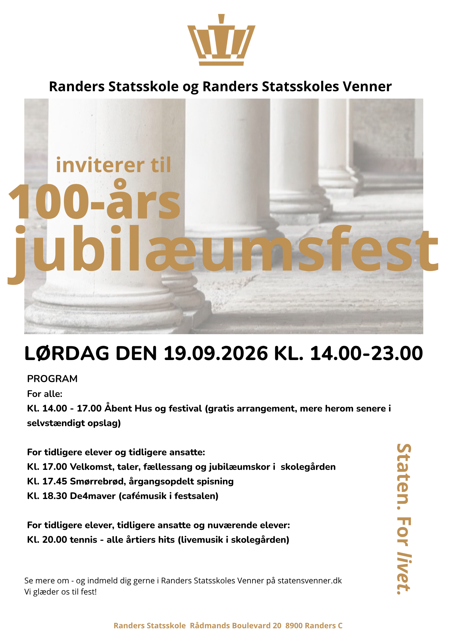 I efteråret 2026 fylder Randers Statsskole 100 år. Eller i hvert fald bygningen på Rådmands Boulevard, tegnet og opført af Hack Kampmann og søn i 1926.