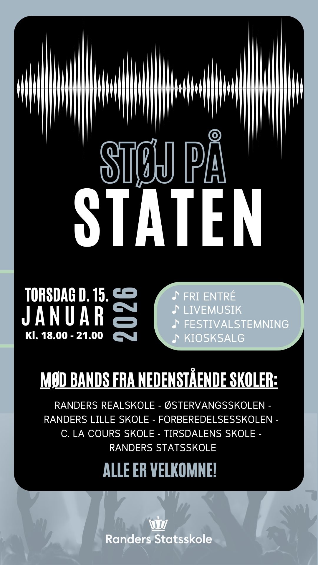 Torsdag d. 15. januar kl. 18-21 afholder Randers Statsskole for 5. år i træk musikfestivalen Støj på Staten for alle byens grundskoler og skolens musikelever i hallen.